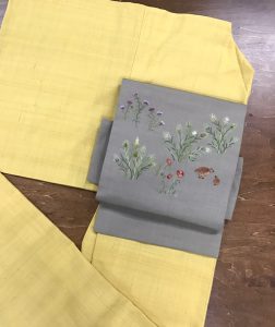 帯地は、茶色味を帯びたグレーで、明るい黄色とのバランスがとても良いです。