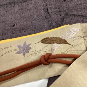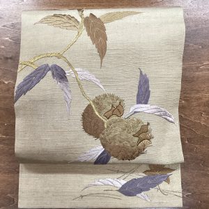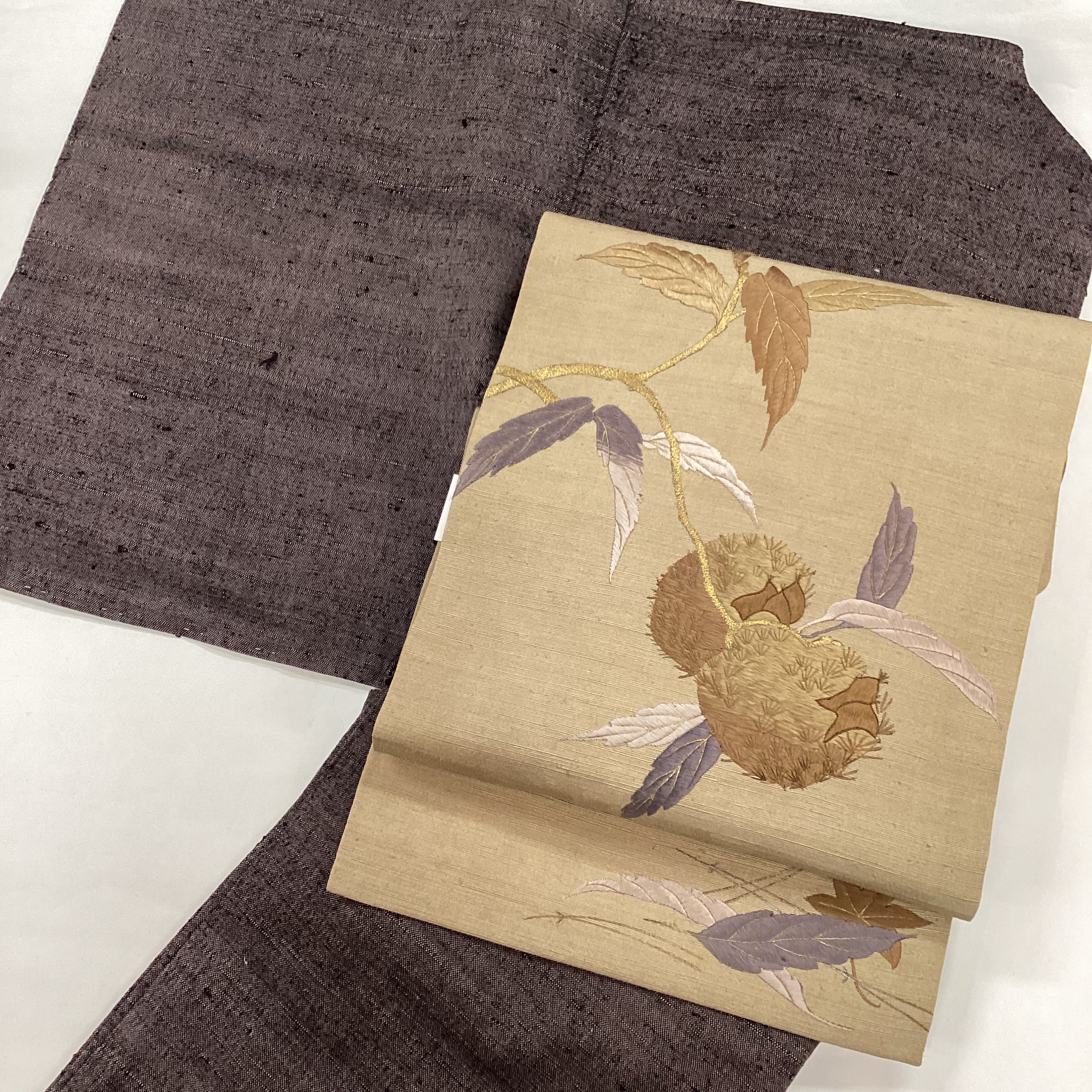 合わせましたのは、大きな栗がお太鼓いっぱいに刺繍された大胆な帯ですが、色調が抑えたものになっているのでしっくりと着物に馴染みますよ。