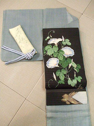 モダンな形をしたつぼみが絞り染のようで、可愛らしい葉っぱのかげから覗いているような図のお太鼓、たれ先には、井戸の縁が見えます。