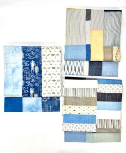 色々布をコラージュした帯は、まるでアート作品のよう。