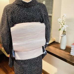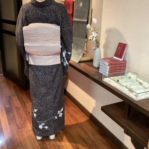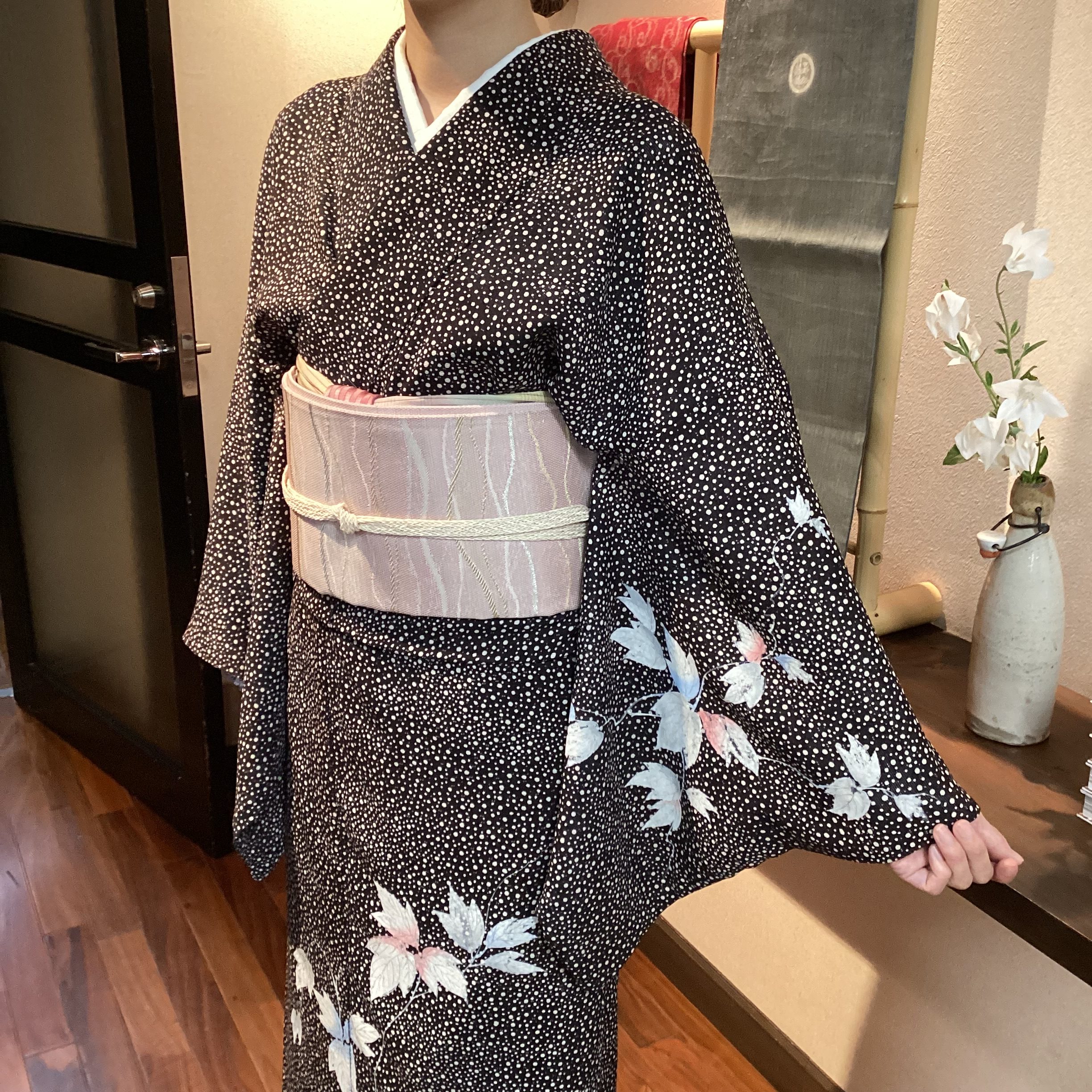 お客様の装い〜夏にエレガントな装い 本日は夏のエレガントな素敵な装いでお越しのお客様のご紹介です。黒地に白の大小霰に意外性のあるブルー、ピンクの葉が描かれた女性らしい雰囲気の小紋。 お手持ちのピンクの夏帯を合わせてエレガントな着姿ですね。 お写真のご協力いただいたお客様、ありがとうございました。 皆様も着物でお出掛け下さい。