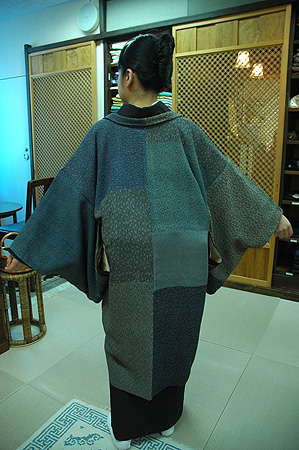 羽織はそのような様々な藍色に、渋煤竹色の茶系との明治期江戸小紋を接ぎ仕立てました。