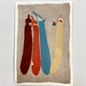 元来不器用な私は、技術本位のものは駄目なので、色の取り合わせだけで、何か面白いものが出来そうに思ってやってみた。布の妙味とでもいうのか、こんな布がと思うものが、すばらしく生きていくのが、たまらなく楽しいのである。」