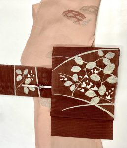 合わせた帯はこっくりした臙脂色の絽綴れ、銀と白糸でだいたんな萩を織りだした名古屋帯:22000円