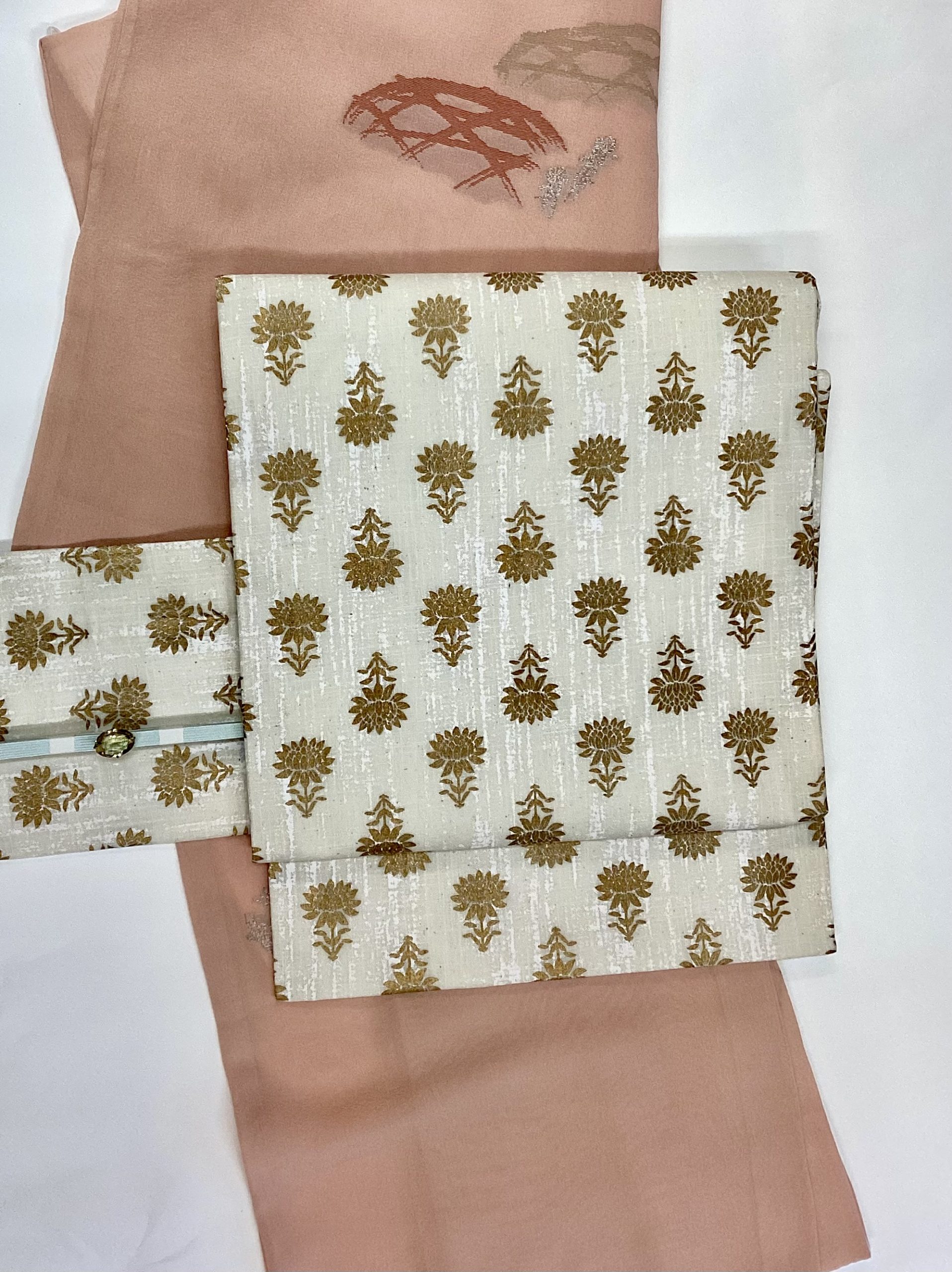 インドのしっかりした木綿に金色のブロックプリントを施した名古屋帯。金の煌めきがちょっとちゃんとした印象を与える素敵な帯。28000円