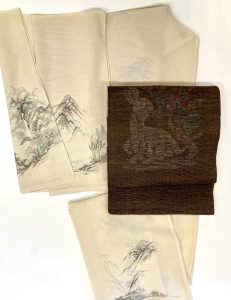 ひょっこりとした晴れ間のお出かけに象牙色の紗。涼しげな山や樹木の山水文様をさらっと描いた付け下げですが、小紋風に気軽に着ていただけます。サイズもたっぷりあります。