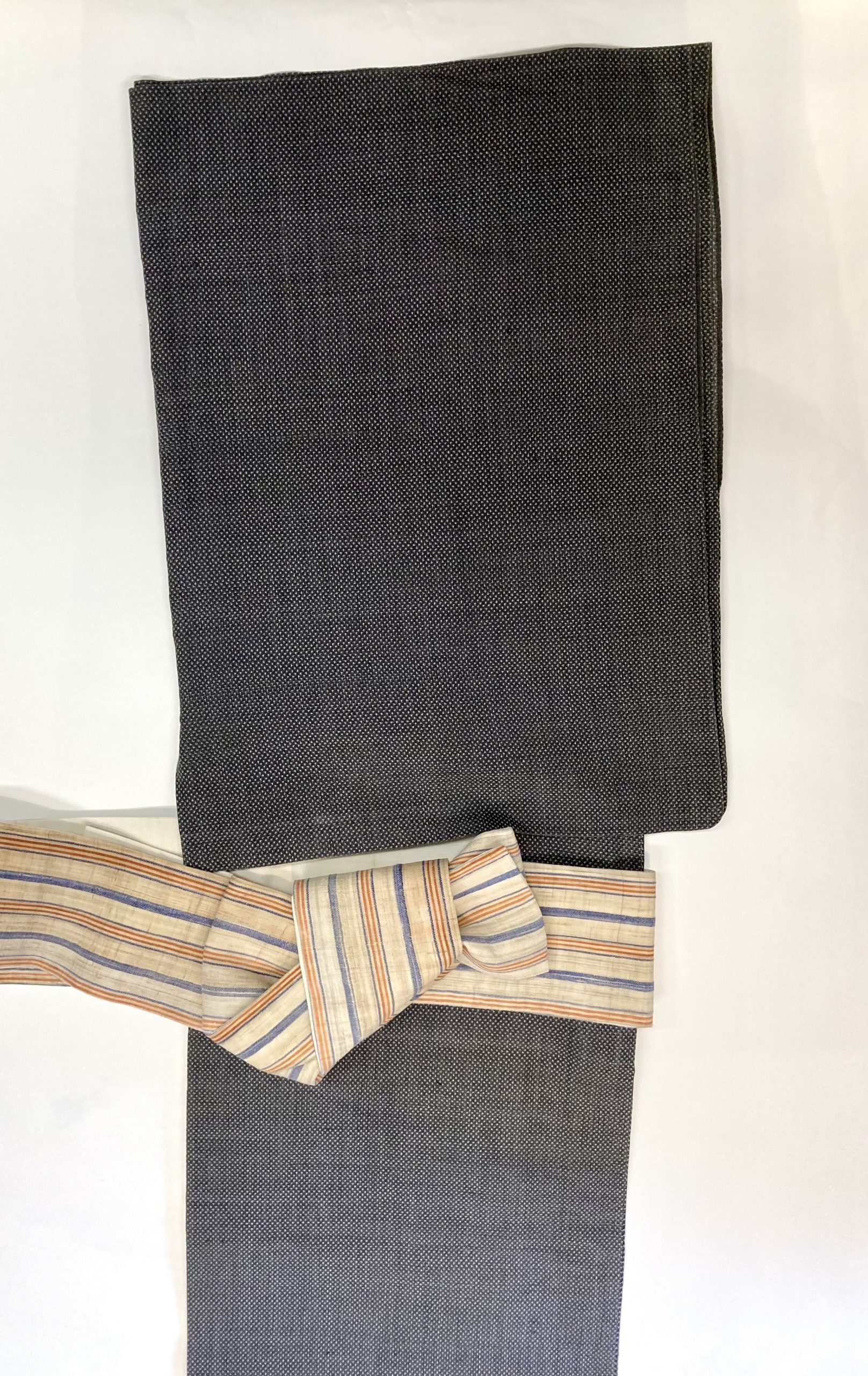 着物は古代越後上布、帯は大麻のきれいな縞の角帯。大麻は現代では大変貴重な自然布、この布は100年以上前のものです。