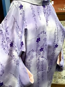 おおらかな桜が艶やかな長羽織、紫ぼかしに枝垂れ桜がだいたんで可愛いアンティークの魅力あふれる一枚です。