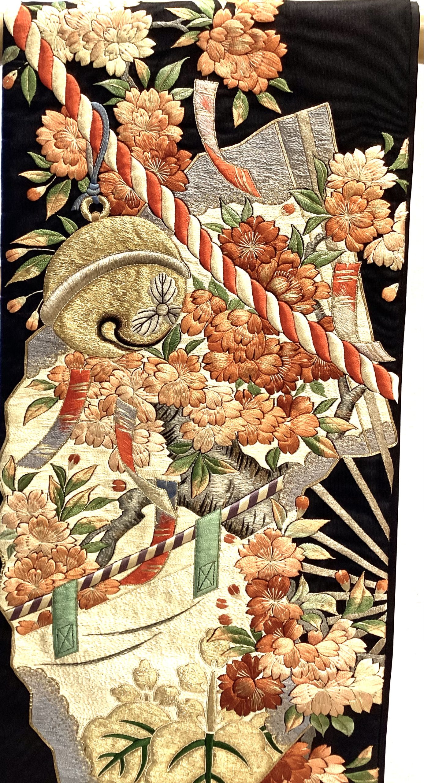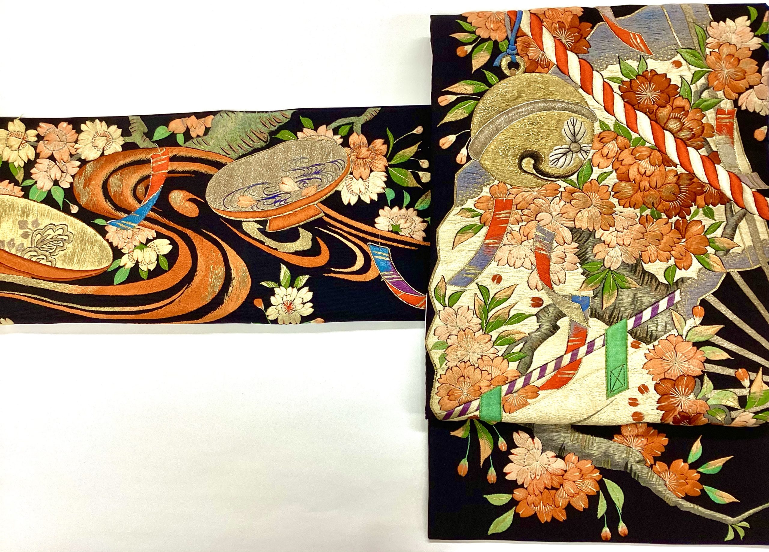 まさに花の宴たけなわ!どっしりした黒の綴れに、ふっくら豪勢な刺繍で、楽しさを演出しています。前柄は盃に流れ…どんな方が締められた帯か、想像するだけでもウキウキしてしまう逸品です。