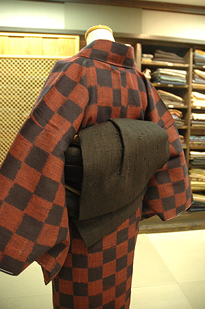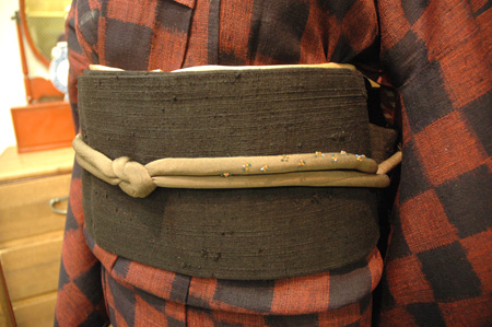 浦野氏作にはおなじみの、経糸にふしのある黒無地の紬帯です。