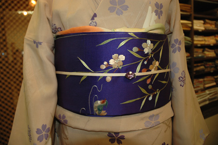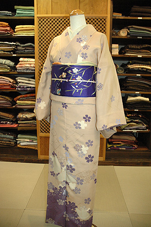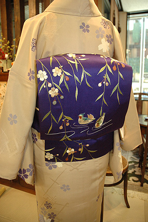 ほんのりした色合いの柔らかな錦紗縮緬に桜と蝶が舞う付下に、青紫色の繻子に枝垂れ桜のもと、ちいさな鴛鴦が水面を逍遥する刺繍帯。