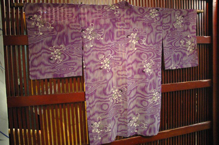 杜若色にブドウ色、グレーの色目の伊予縞の染単衣羽織。