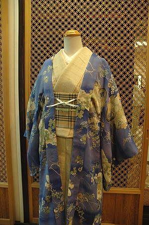 まるで麻のような質感の生成り色の単衣は見た目にも涼しく、夏日が多くなる5月におすすめです。羽織はアンティークの花車模様が優美な透紗紋(すきしゃもん)という織り。