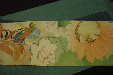 帯の前柄はユリに撫子そして大胆なヒマワリ、優しいお太鼓のバラの図とのバランスがとれています。