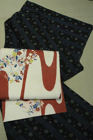3cm巾のしっかりした棒縞に、水玉と大小の井桁絣。