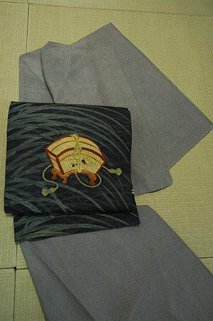 鉄紺の葦の織柄紗地に籠の縁取りの黄赤が映え、まだ残暑が残る季節なので明るい薄鼠色の鮫絽小紋とあわせてみました。