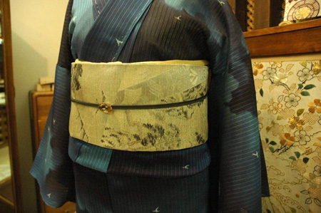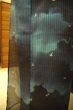 この着物をスタッフ皆で見ていても、「きれいな青空」「夕暮れ時の海」「夕立前の急な雨雲に鳥達が慌てている」など、とらえかたが違っていて、それぞれが心に描く空想の世界を言葉にするのも、新鮮で面白いねと話したのでした。