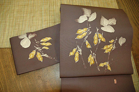 ご紹介する名古屋帯は、紫がかったグレーの塩瀬に軽やかな筆使いの落花生が描かれています。