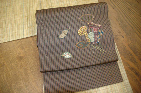 もう1点は細縞の紬地に、カラフルなきのこをアップリケやビーズ刺繍で表現した楽しい帯。