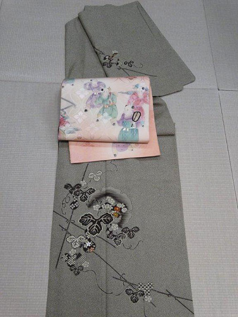 茶色で渋めですので桃色ぼかしで明るいめの帯との組み合わせに。
