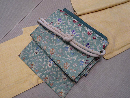 若緑の織帯は、昔の丸帯を名古屋仕立てにしたもの。