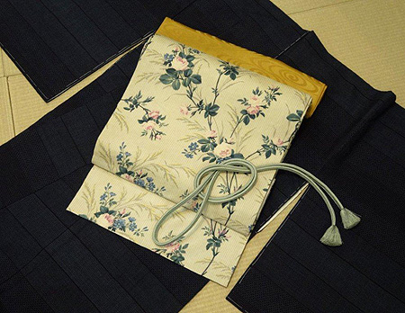 合わせた明るい地の薔薇帯は、19世紀のイギリスのインテリアファブリックを帯に仕立てたもの。