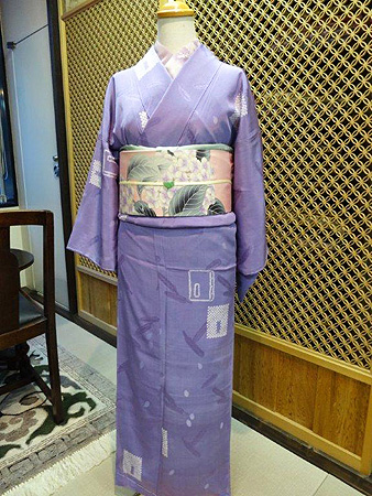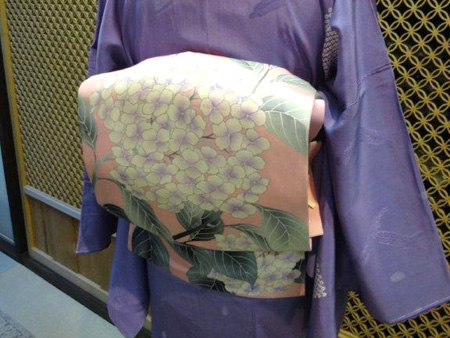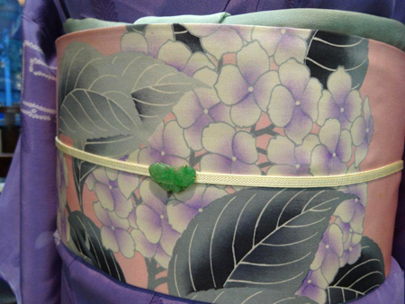 纏うひとを、いっそう優艶に見せる淡い紫の小紋には、大輪の紫陽花を染めた帯、帯留は翡翠の蝶を合わせました。