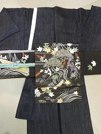 粋な黒の男縞の宮古上布に、刺繍も華やかな川景色の名古屋帯・・・