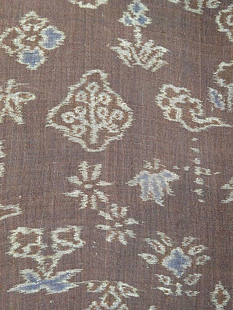 あずき色に花唐草文様が、横総絣で織られた小千谷縮。