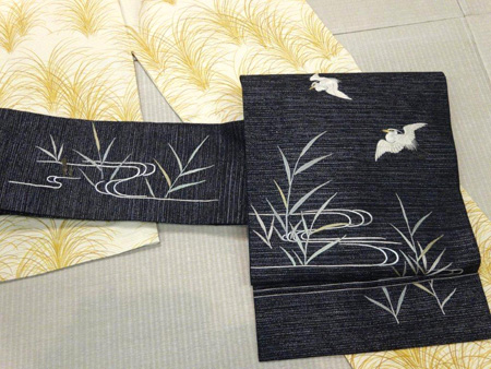 黒地の帯ですが、白鷺が涼しさを演出するすてきな一本です。