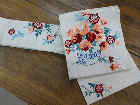 アールデコのデザイン画のような薔薇の花が刺繍された帯。