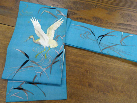 鮮やかな碧の湖に舞い降りる、鷺の刺繍帯。