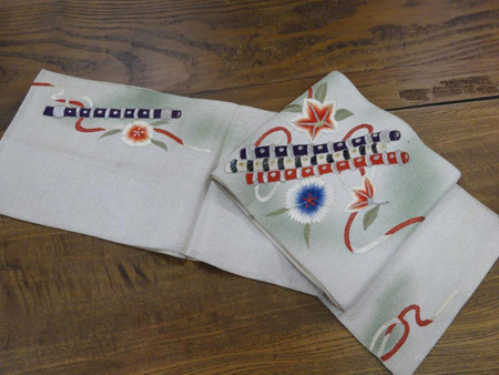 片隅に、日本らしい撫子が何気なく刺繍されているところが微笑ましい、大変可愛らしい帯です。