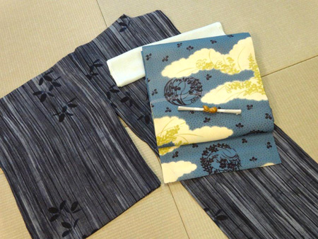 合わせた帯びは錦紗の着物から帯に仕立て直した、雲紋に萩と撫子柄の染帯です。