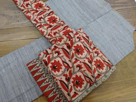 縄文笹山紬帯は茜色が華やかで美しいインド更紗、手紡ぎ木綿のアンティークです。
