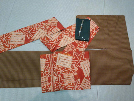 写真は艶やかな秋田黄八丈に、茜染めで紅葉と源氏香をあらわした帯であでやかに組み合わせました。