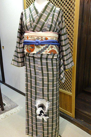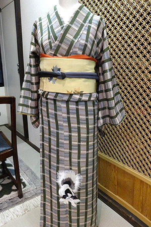 縮緬染に狆の刺繍小紋にスザニ名古屋帯「一番美しいのは、糸そのもの」と話されていたという、志村さんの染めた糸が約300本集められ、どのような作品になっているか・・・草木染の絹糸が、どのような表情を見せるか・・・ぜひ、足を運んでご覧になってみてください。