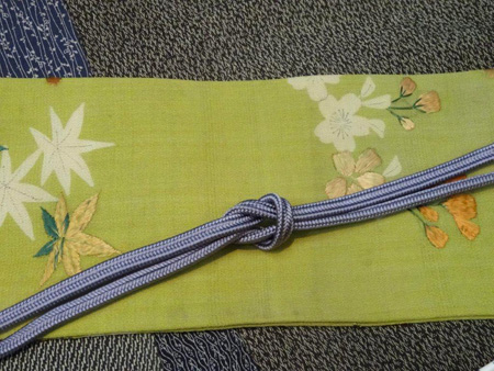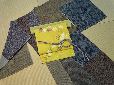 合わせた帯は、鶸色の江戸縮緬に桜と紅葉が刺繍された名古屋帯です。