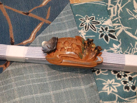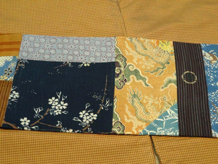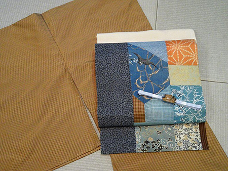 黄八丈に合わせた帯は江戸縮緬、江戸小紋、古い黄八丈を切り継ぎしたものです。