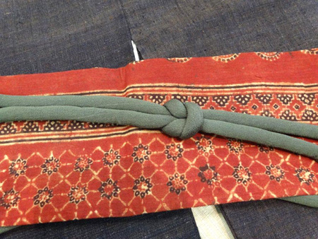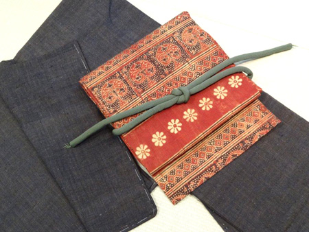 写真のインド更紗帯は地の部分は茜で染め、生命の木をかたどったモチーフや更紗らをブロック染めしたも。シックな結城縮袷などと合わせて深まる秋を楽しんでみては如何でしょうか。