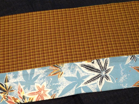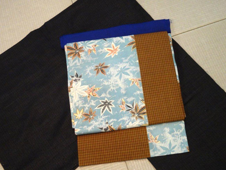 写真の帯は一面に舞い散る紅葉を染めた縮緬と黄八丈を切継ぎした帯です。