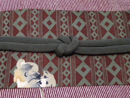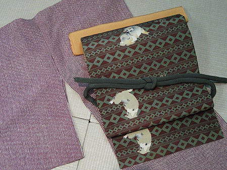 帯は横段の枡文に愛嬌のある犬が飛んでいます。