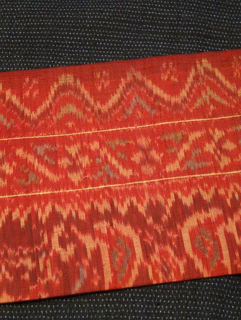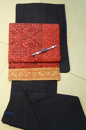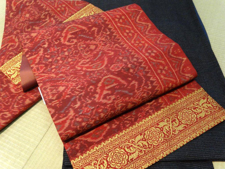 結城紬袷にリマール織名古屋帯リマール織はインドネシアスマトラの州都、バレンバンを中心とした広い地域で20世紀前半頃まで織られていた、緯絣の美しい織り物です。