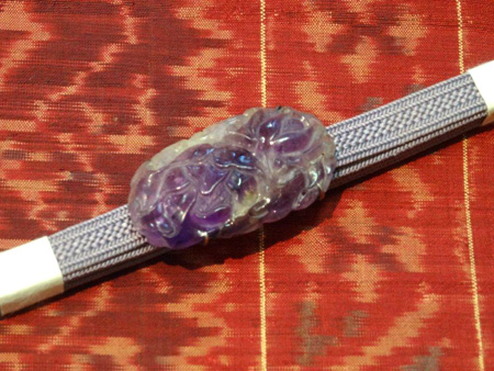 絣の紫と合わせた水晶の帯留でアクセントを付けてみました。