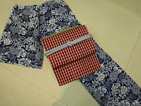 浦野風にすっきりとした無地の帯も素敵ですが、小さめの格子の帯なら藍型の大胆さをそこまで邪魔しません。