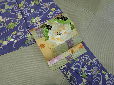 流水に、梅や沢瀉(おもだか)橘に笹が散らされた小紋に、大輪の牡丹が刺繍された華やかなアンティークの帯を合わせてみました。
