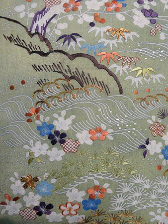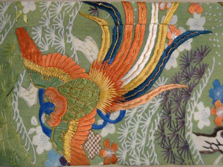 写真の美しい刺繍帯、江戸時代の小袖を名古屋帯にしたものです。