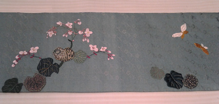 可憐な秋海堂のハート形をした葉は、江戸小紋と刺繍のコラボレーション。