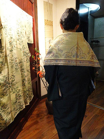 外出の際、着物の衿元に薄いスカーフをしていただくと冷たい風も入ってきませんので、その上にショールをかけると、とても暖かくてお薦めです!