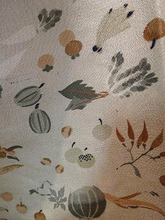 表地は、深い緑色のおとなしめのひげ紬、そしてなんと言ってもこの裏地には、かぶ、とうがらし、竹の子、くわい、大根、蓮根、茄子、人参のお野菜と葡萄、スイカ、りんご、柿、なんとパイナップル!果物がおしゃれな色合いで染められています。